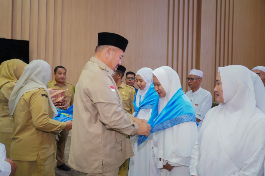 BATUBARA I Bupati Batu Bara H. Baharuddin Siagian, S.H., M.Si., menepung tawari jemaah calon haji Kabupaten Batu Bara Tahun 1447 Hijriah/2026 Masehi yang digelar di Aula Kantor Bupati Batu Bara, Kecamatan Lima Puluh, Senin (20/4/2026).