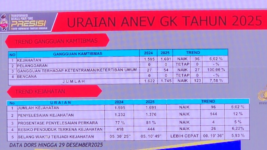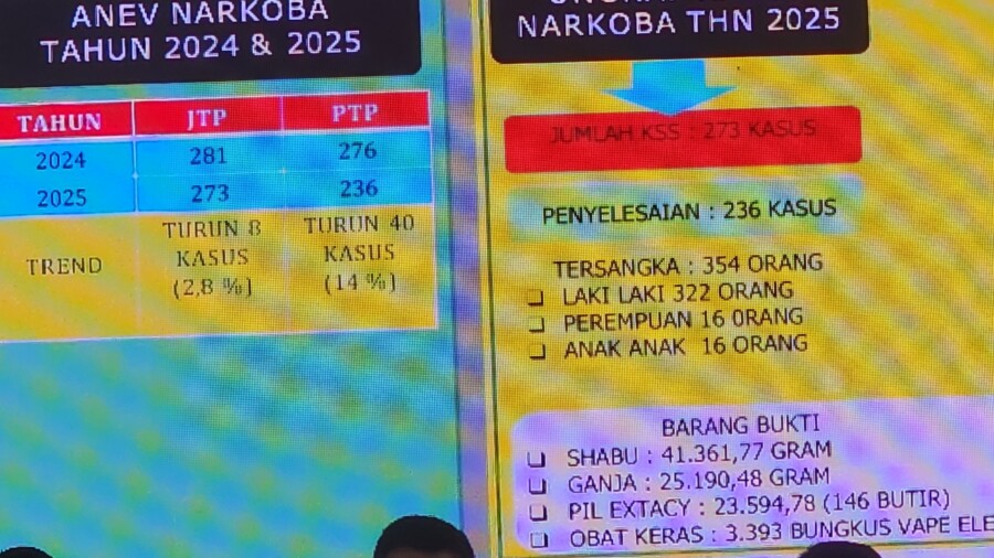Oleh sebab itu Kapolres sampaika. Capaian Kinerja 2025, sejumlah capaian penting, di antaranya, Ungkap Kasus Narkoba tahun 2025 jumlah kasus 273 Kasus dan penyelesaiannya 236 kasus dan tersangka sebanyak 345 orang terdiri laki-laki dan perempuan,