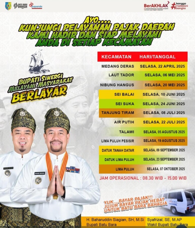 “Diharapkan kepada masyarakat yang wajib pajak agar hadir disetiap kantor kecamatan untum memenuhi kewajiban daerah Layanan ini akan dilaksanakan secara bergilir sesuai dengan jadwal yang telah ditetapkan, mencakup seluruh kecamatan di wilayah Kabupaten Batu Bara”