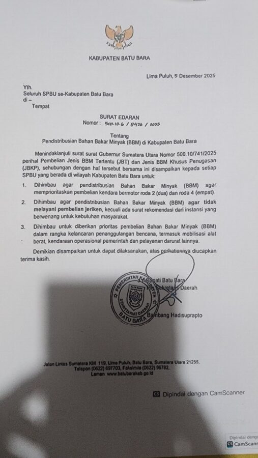Dalam edaran tersebut, Bupati Batu Bara menindaklanjuti surat surat Gubernur Sumatera Ulara Nomor 500.10/74 1/2025 perihal Pembelian Jenis BBM Tertentu (JBT) dan Jenis BBM Khusus Penugasan (JBKP). sehubungan dengan hal tersebut bersama ini disamnpaikan kepada setiap SPBU yang berada di wilayah Kabupaten Batu Bara untuk: