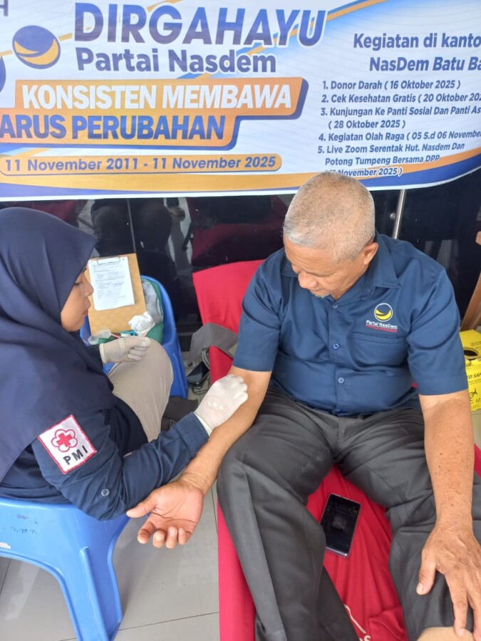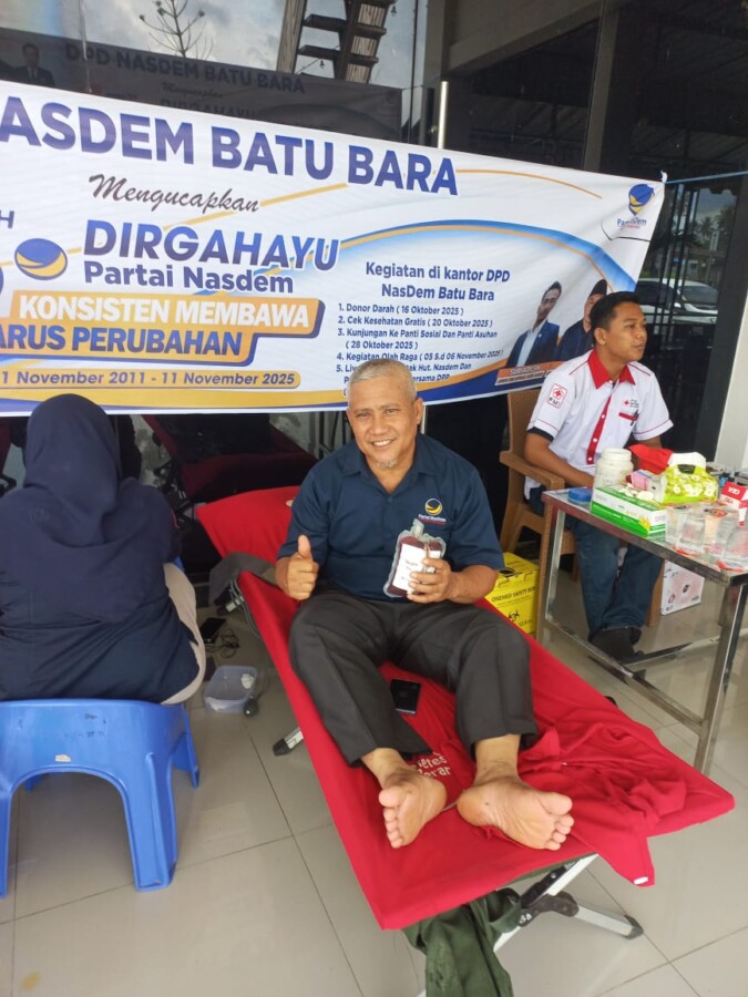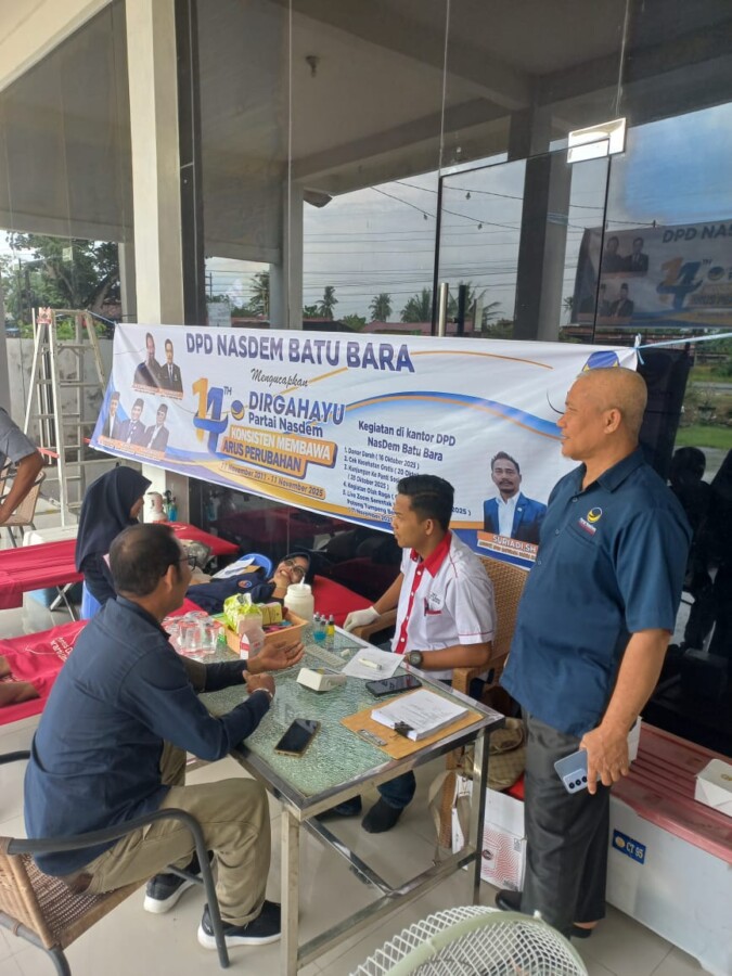 BATUBARA I Dalam rangka memperingati Hari Ulang Tahun ke-14 Partai NasDem, Dewan Pimpinan Daerah (DPD) Partai NasDem Kabupaten Batubara menggelar kegiatan donor darah sebagai bentuk kepedulian terhadap sesama, Sabtu (19/10/2025). di Kecamatan Medang Deras tepatnya di Sekretariat DPC NasDem Medang Deras.