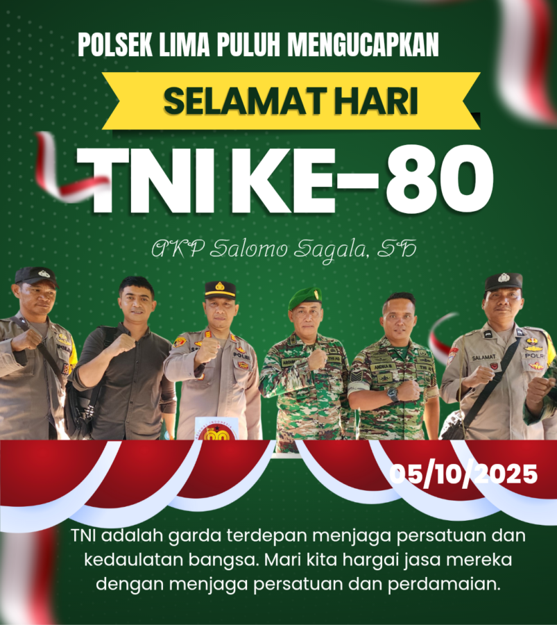 Kapolsek AKP Salomo Sagala, SH bersama Kanit Reskrim Ipda Wira Hidayat serta jajaran mengucapakan selamat Hari Ulang Tahun ke-80 untuk Tentara Nasional Indonesia. TNI adalah garda terdepan bangsa yang selalu bersinergi dengan Polri dalam menjaga keamanan dan ketertiban masyarakat