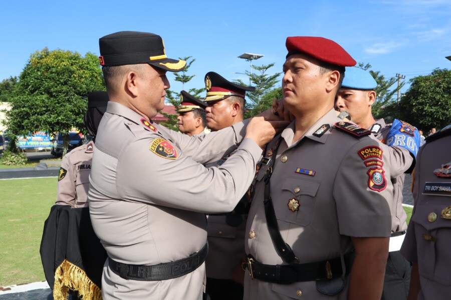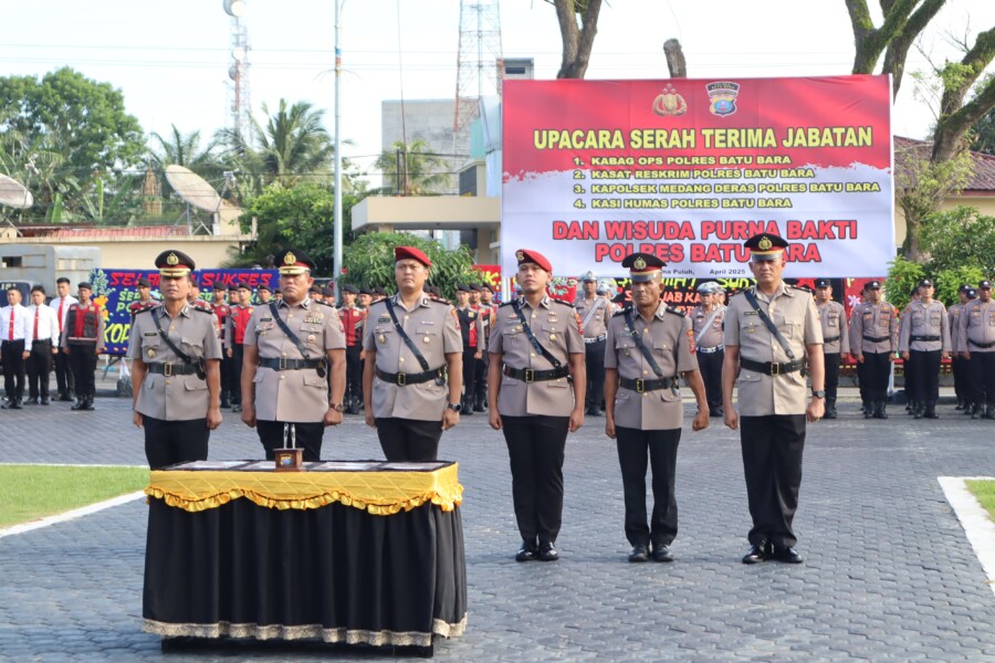 BATUBARA I Kapolres Batubara AKBP Doly Nelson H.H Nainggolan SH M.H memimpin sertijab PJU serta wisudawan Purna Bhakti Polres Batubara Personil Polres Batubara, Senin (21/4/2025)