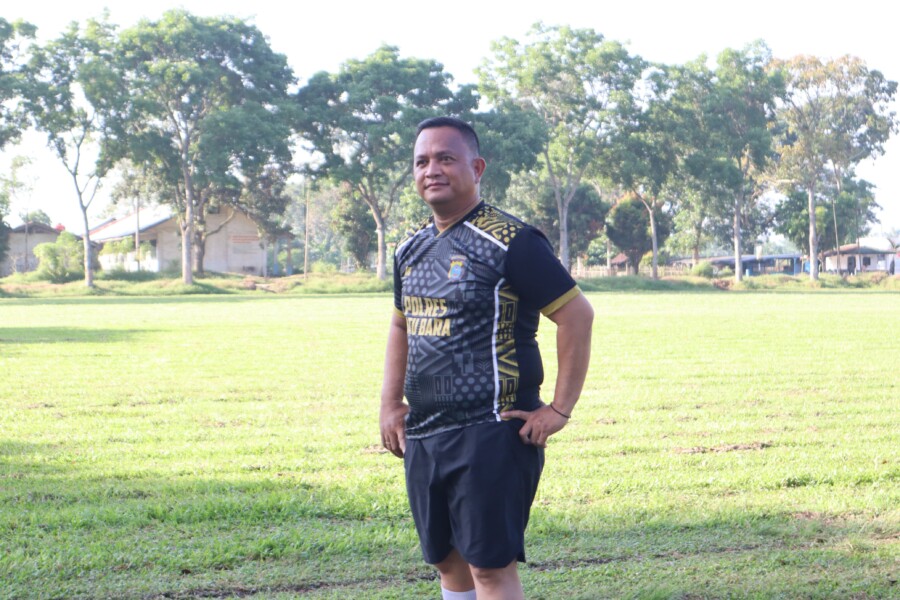 BATUBARA I Kapolres Batubara AKBP.Doly Nelson H.H Nainggolan bersama seluruh PJU , Para Kapolsek Olahraga bola kaki bersama dengan para kades dan toko masyarakat dilapangan bola kaki dolok pop Kecamatan Lima Puluh, Jumat (23/5/2025)
