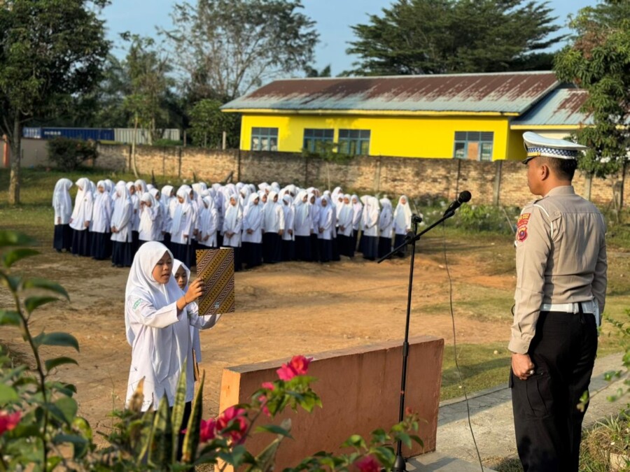 Acara Police Goes To School digelar di MTs Negeri Batu Bara, Senin (26/1/2026), Ia menyampaiannya di hadapan para siswa, Kanit Kamsel mengajak pelajar untuk memahami dan mematuhi aturan lalu lintas, baik sebagai pengendara maupun pengguna jalan.