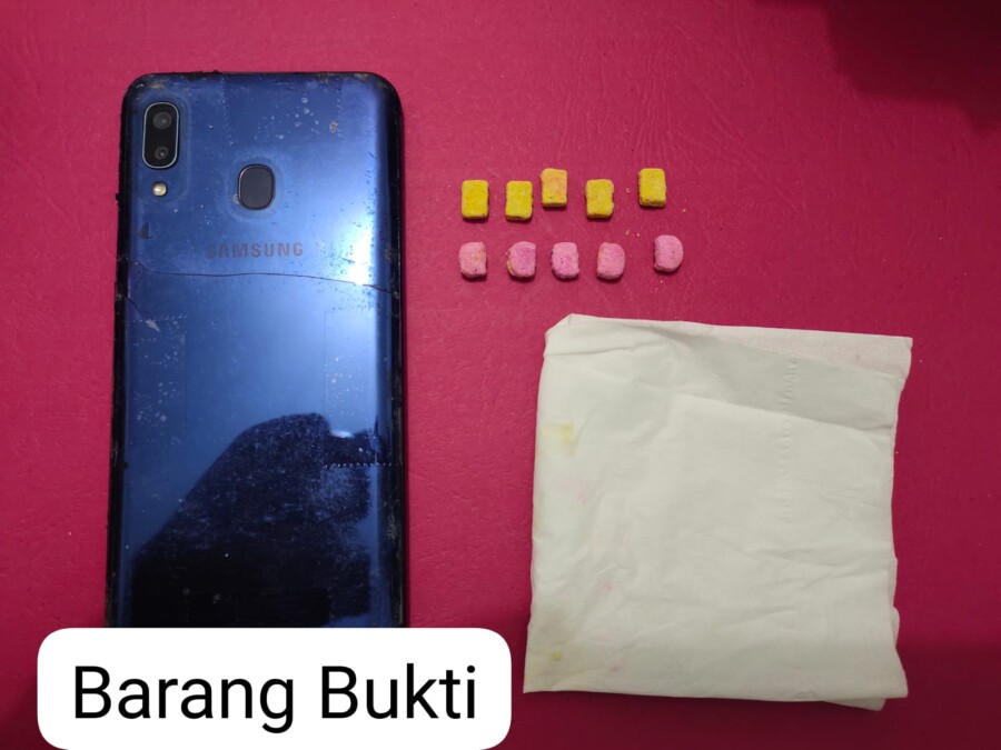 Adapun barang bukti diamankan berupa 5 butir Narkotika Pil MDMA/ Ekstasi Warna Kuning dengan berat brutto 1,43 Gram. 5 Butir Narkotika Pil MDMA / Ekstasi Warna Kuning dengan berat brutto 1,47 Gram. 1 Unit Handphone Merk Samsung A20 Warna Biri dan 1 Unit Sepeda Motor Vario Warna Merah Tanpa Nopol.