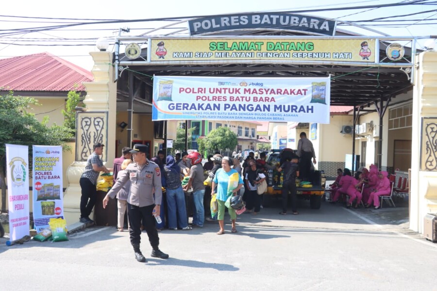 BATUBARA I Dalam rangka mendukung ketahanan pangan dan membantu masyarakat menghadapi tingginya harga kebutuhan pokok, Polres Batubara berkolaborasi dengan Buloq menggelar kegiatan Gerakan Pangan Murah, dengan menjual beras dan minyak goreng murah kepada masyarakat.