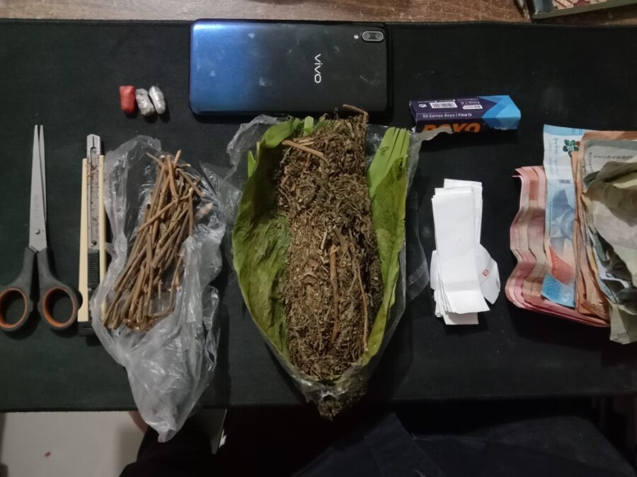 Setelah memastikan keberadaan target, petugas langsung melakukan penangkapan dan penggeledahan. Dari hasil penggeledahan, ditemukan barang bukti berupa 1 bungkus besar daun ganja kering dengan berat brutto 75,92 gram, 3 bungkus kecil daun ganja kering dengan berat brutto 1,51 gram, 1 bungkus plastik berisikan ranting daun ganja, 1 unit handphone merk Vivo, 1 buah gunting, 1 buah pisau, 87 lembar kertas rokok (royo), serta uang tunai sebesar Rp623.000.