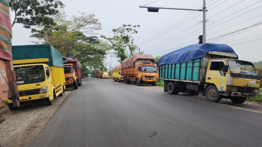 Dari pantauan di lokasi, truk-truk, Minggu (15/2/2026), tersebut terparkir berjajar di kiri dan kanan jalan. Sebagian kendaraan tampak berhenti cukup lama dengan muatan tertutup terpal. Situasi ini membuat pengendara roda dua maupun roda empat harus melambat dan bergantian melintas karena badan jalan menjadi sempit.